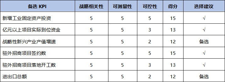 可对备选指标从相关性、可衡量性、可控性、可激发性进行定量评价,选取得分较高的指标作为关键绩效考核指标。