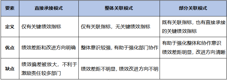 直接承接模式:部门直接承接与部门职责相关的开发区指标,未与开发区整体绩效关联。整体关联模式:部门无具体关键绩效指标,按照一定的权重与开发区整体绩效关联。部分关联模式:部门即承接与部门职责相关的开发区指标,也与开发区整体绩效关联。