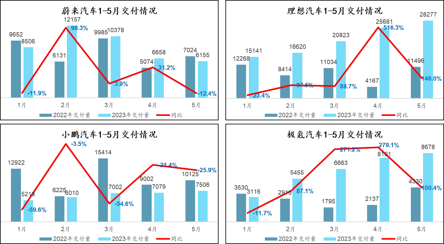横向对比大概了解了新能源车市整体的景气度在恢复,纵向对比再来看看车企的历史交付数据,经营情况到底是变好还是变差呢?