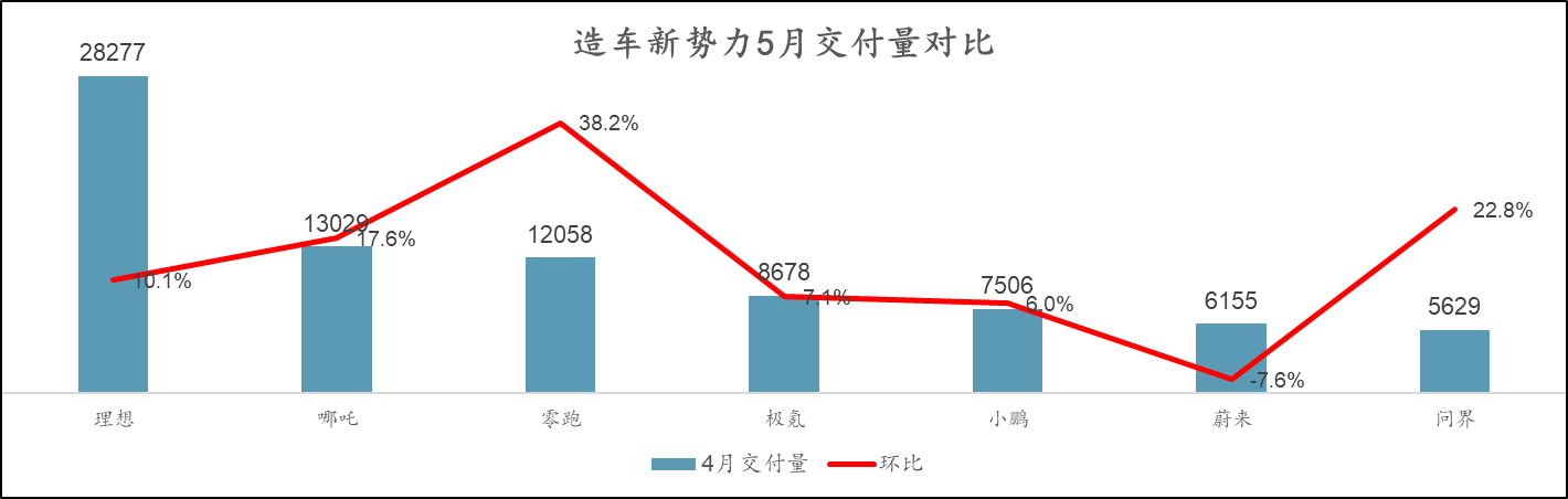 相较于4月份,5月份新能源车市继续回暖,被统计的几家造车新势力5月销量排名与4月一致,整体呈上升趋势。