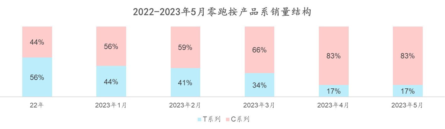 具体车型来看,C系列交付10000+台,环比增长超38%,占比超83%;其中C11车系交付7100+台,位列国产B级新能源SUV NO.1。自2022年起,零跑汽车的销量结构发生了重要变化,15-20万的C系列(C01和C11)产品的销量不断增长,份额从22年的44%,提升到4月83%。C系列交付破万让零跑品牌实现了从10万元以内,到15-20万元主流市场的跃迁。从高往低打是相对容易的,从低往高打实现成功的零跑汽车,恰恰证明了自身的实力。