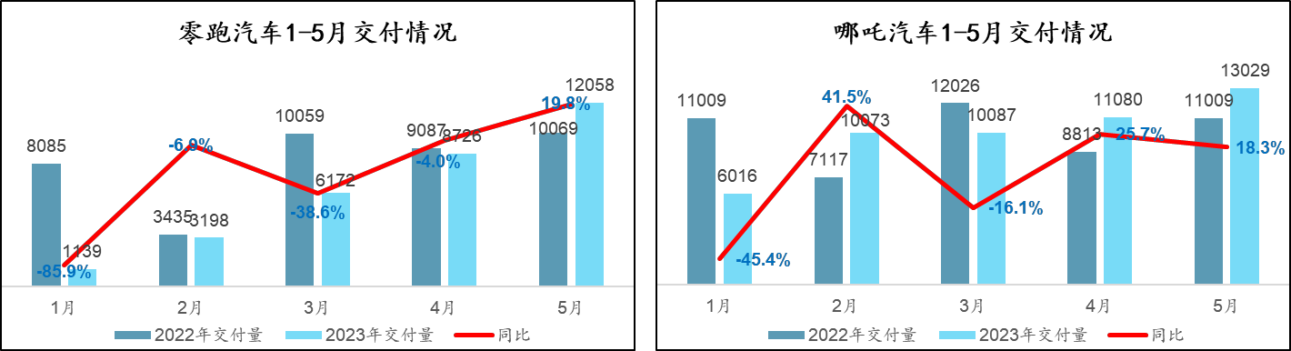零跑汽车本月继续维持4月份排名列新势力第三位。5月零跑汽车共交付新车12058辆,同比增长19.8%,环比增长38.2%。2023年零跑汽车主打“油电同价”,新款上市性价比凸显,竞争优势明显提升,带动销量持续回暖。